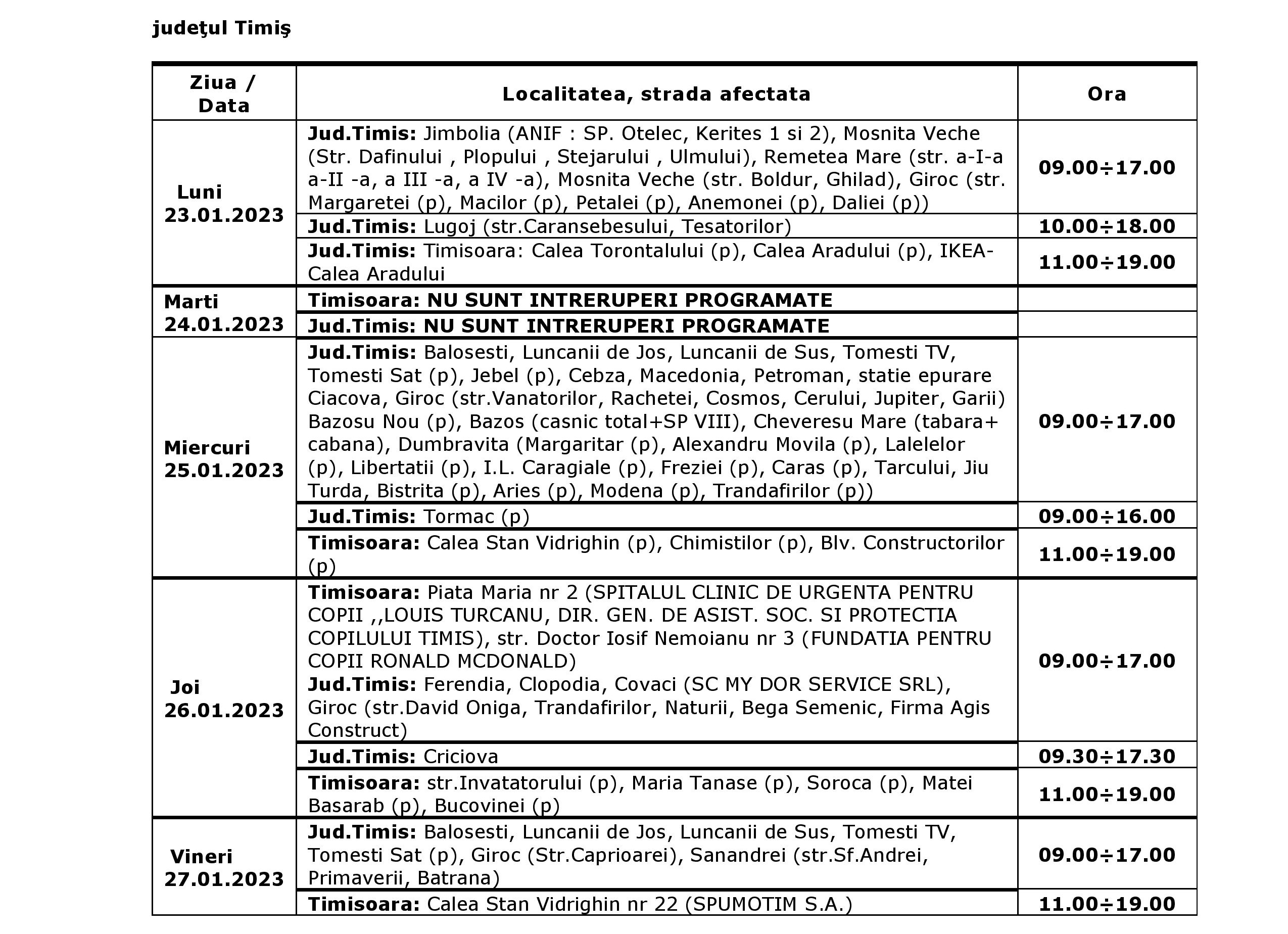 Lucrările au fost reduse la cele care sunt necesare pentru a asigura capacitatea rețelei de a funcționa și a alimenta clienții cu energie electrică în bune condiții. În perioada 23 – 29 ianuarie, curentul va fi întrerupt astfel: