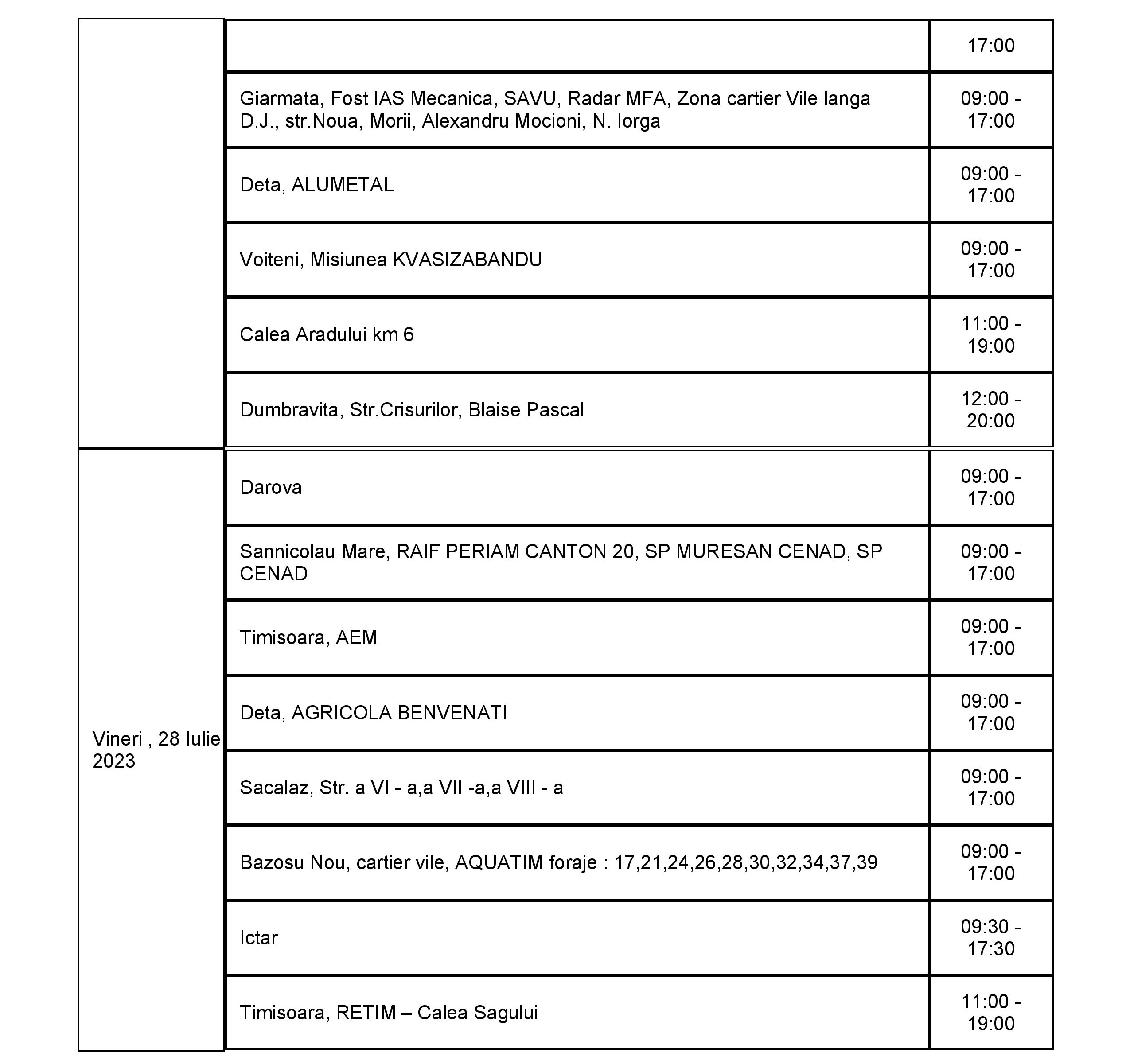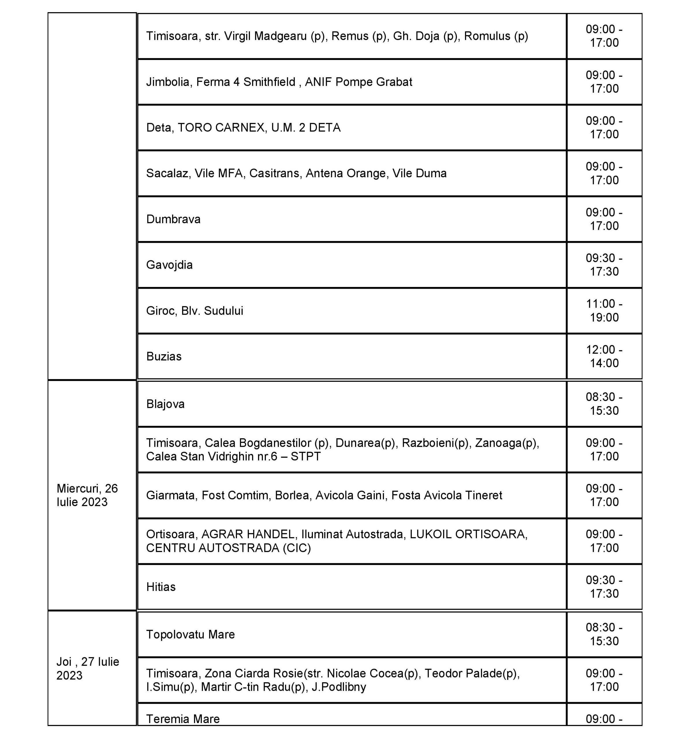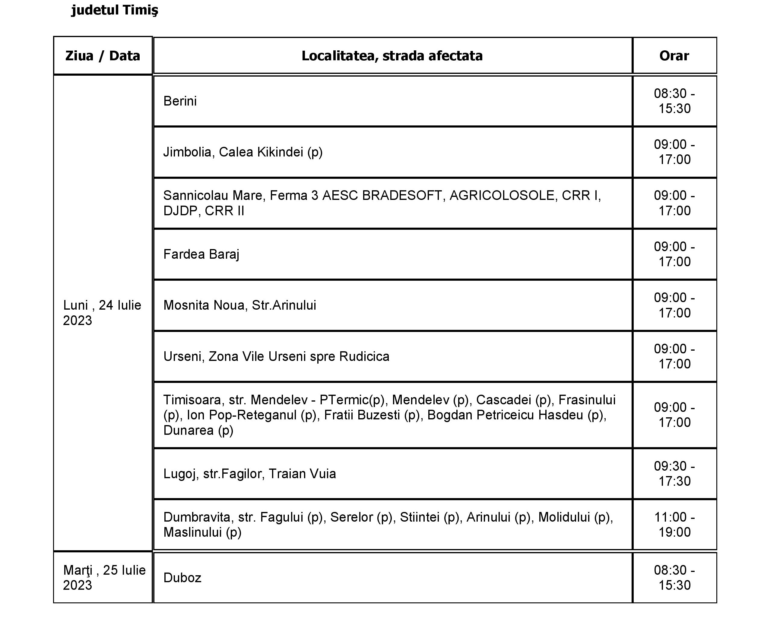 Lucrările au fost reduse la cele care sunt necesare pentru a asigura capacitatea rețelei de a funcționa și a alimenta clienții cu energie electrică în bune condiții. În perioada 24 – 30 iulie, curentul va fi întrerupt astfel: