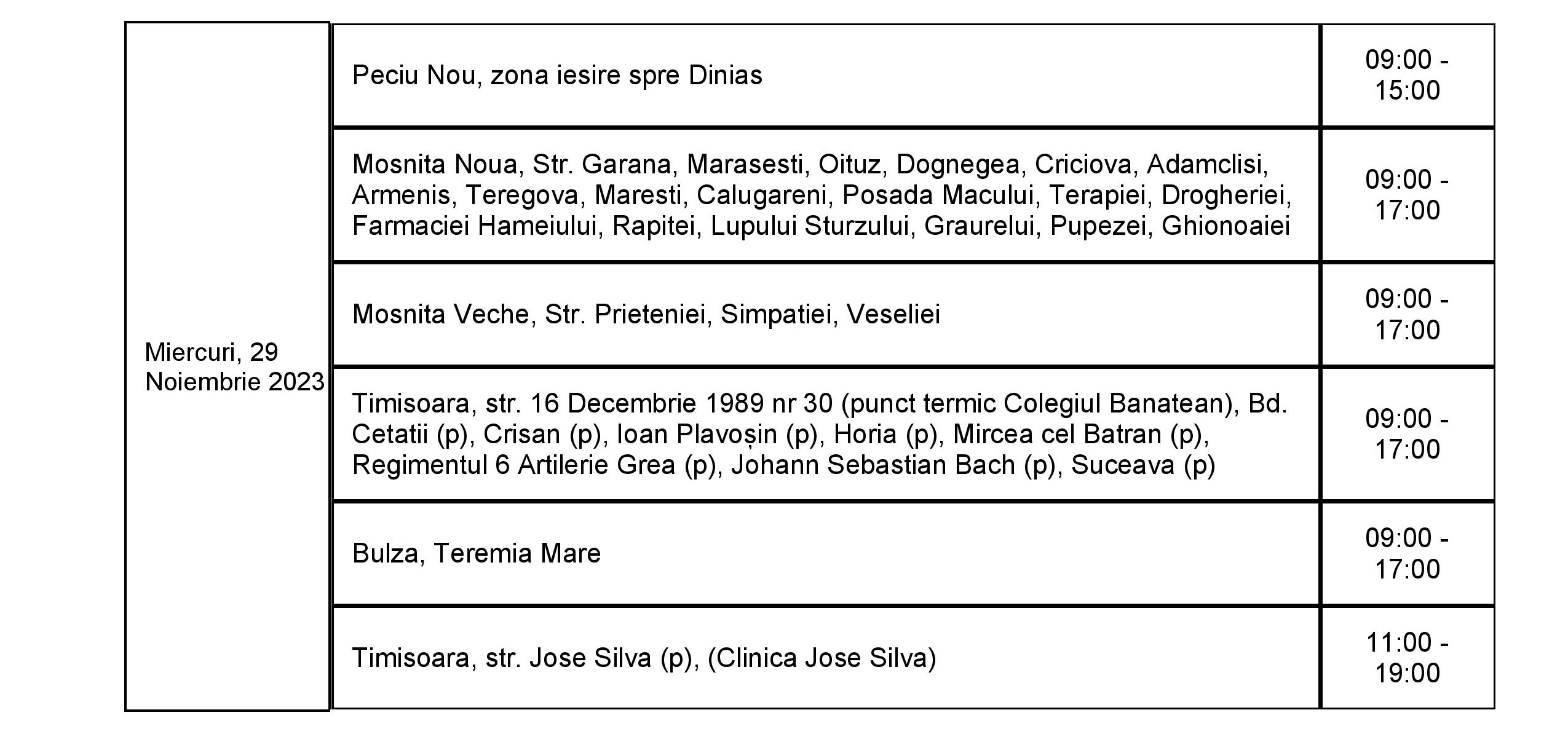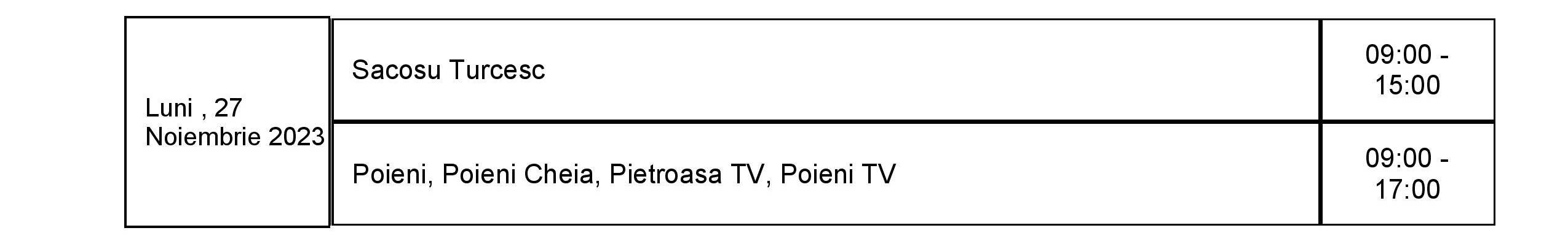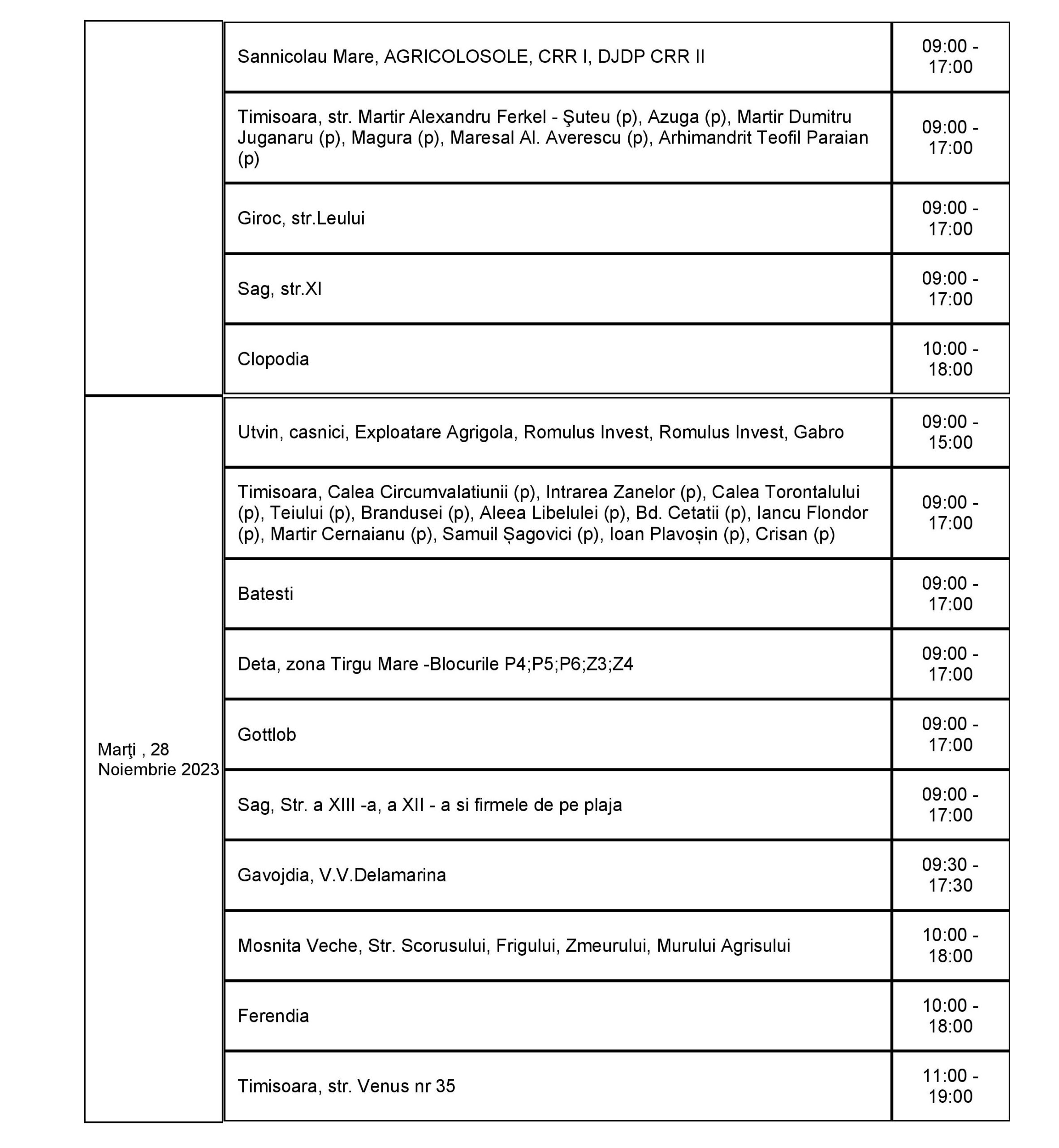 Lucrările au fost reduse la cele care sunt necesare pentru a asigura capacitatea rețelei de a funcționa și a alimenta clienții cu energie electrică în bune condiții. În perioada 27 noiembrie – 3 decembrie, curentul va fi întrerupt astfel: