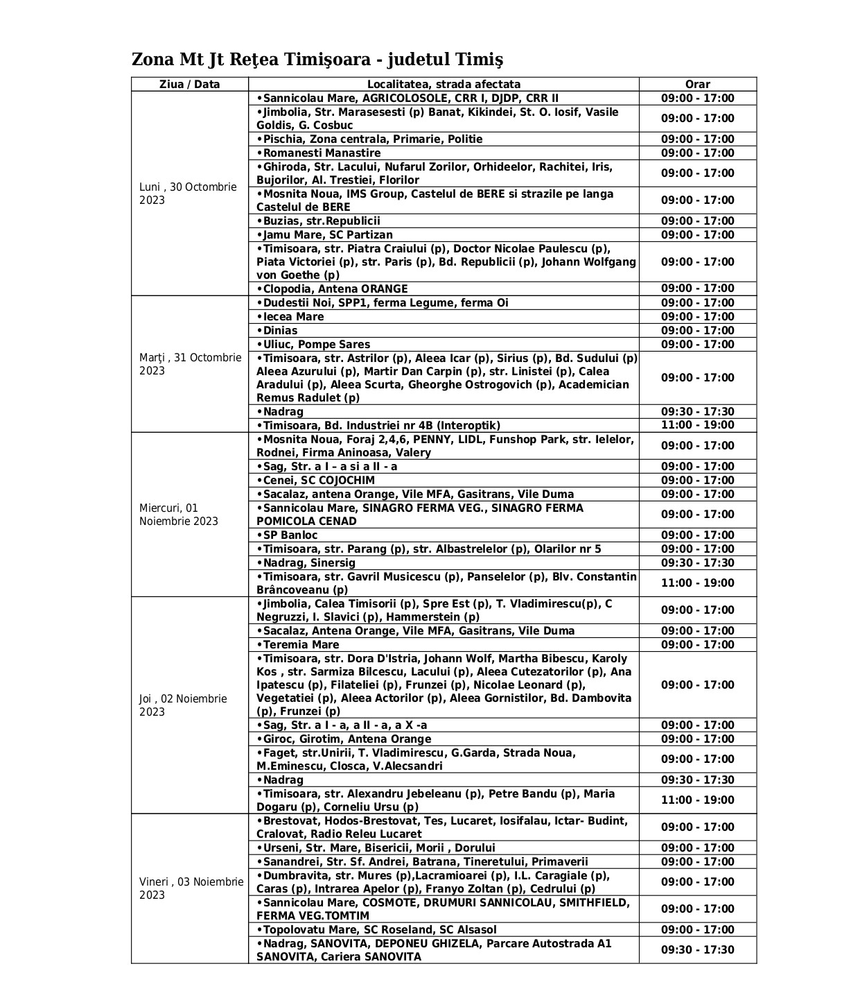 Lucrările au fost reduse la cele care sunt necesare pentru a asigura capacitatea rețelei de a funcționa și a alimenta clienții cu energie electrică în bune condiții. În perioada 30 octombrie – 5 noiembrie, curentul va fi întrerupt astfel: