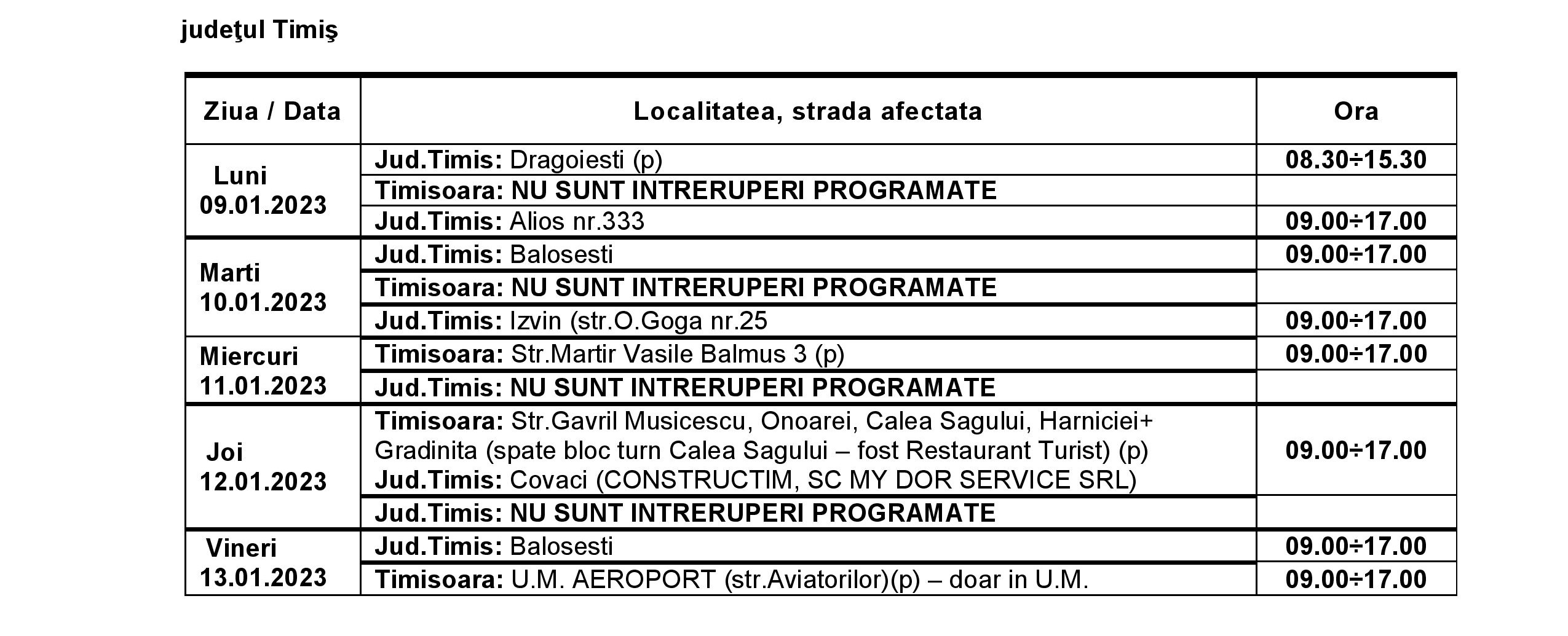 Lucrările au fost reduse la cele care sunt necesare pentru a asigura capacitatea rețelei de a funcționa și a alimenta clienții cu energie electrică în bune condiții. În perioada 9 – 15 ianuarie, curentul va fi întrerupt astfel: