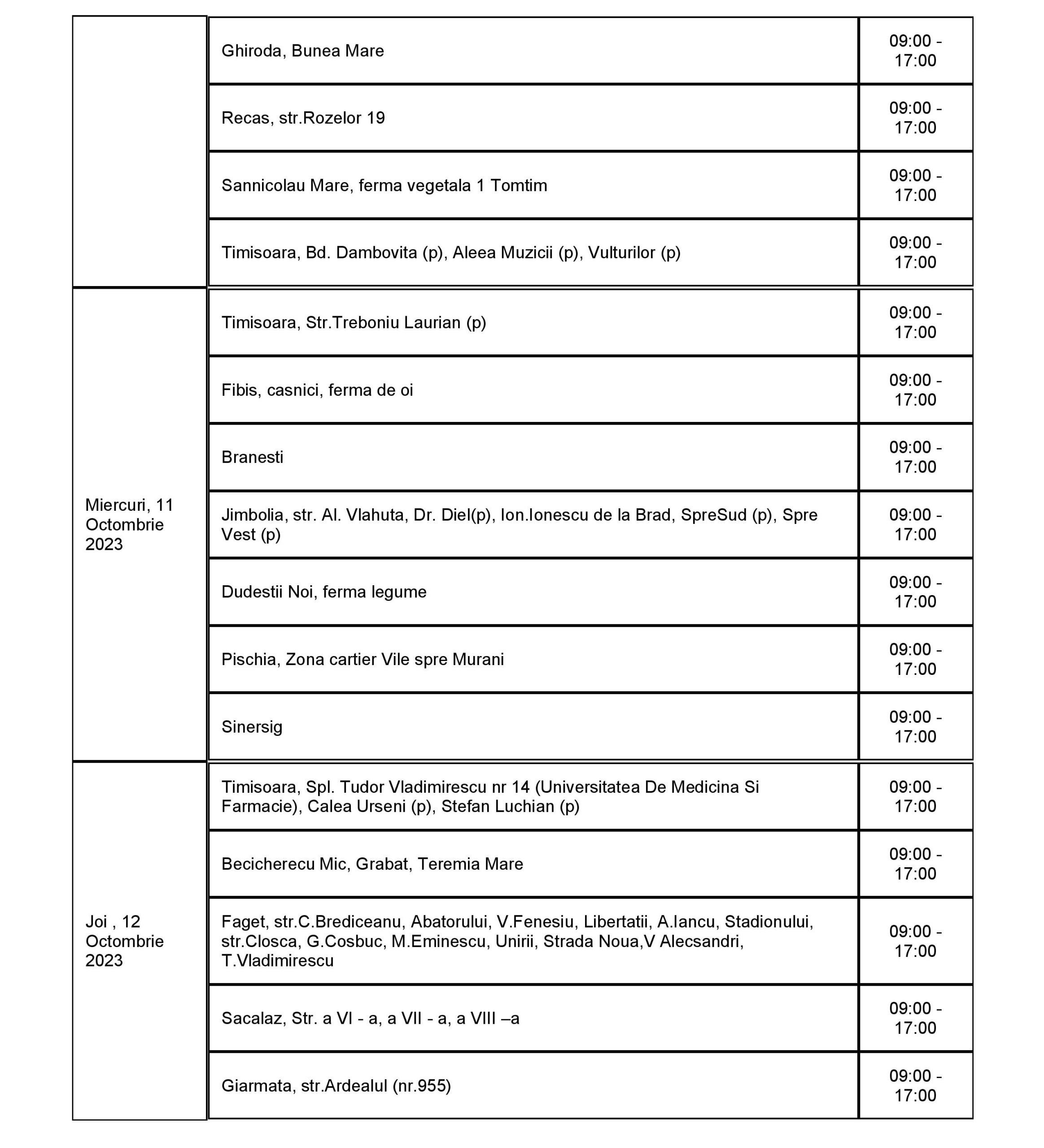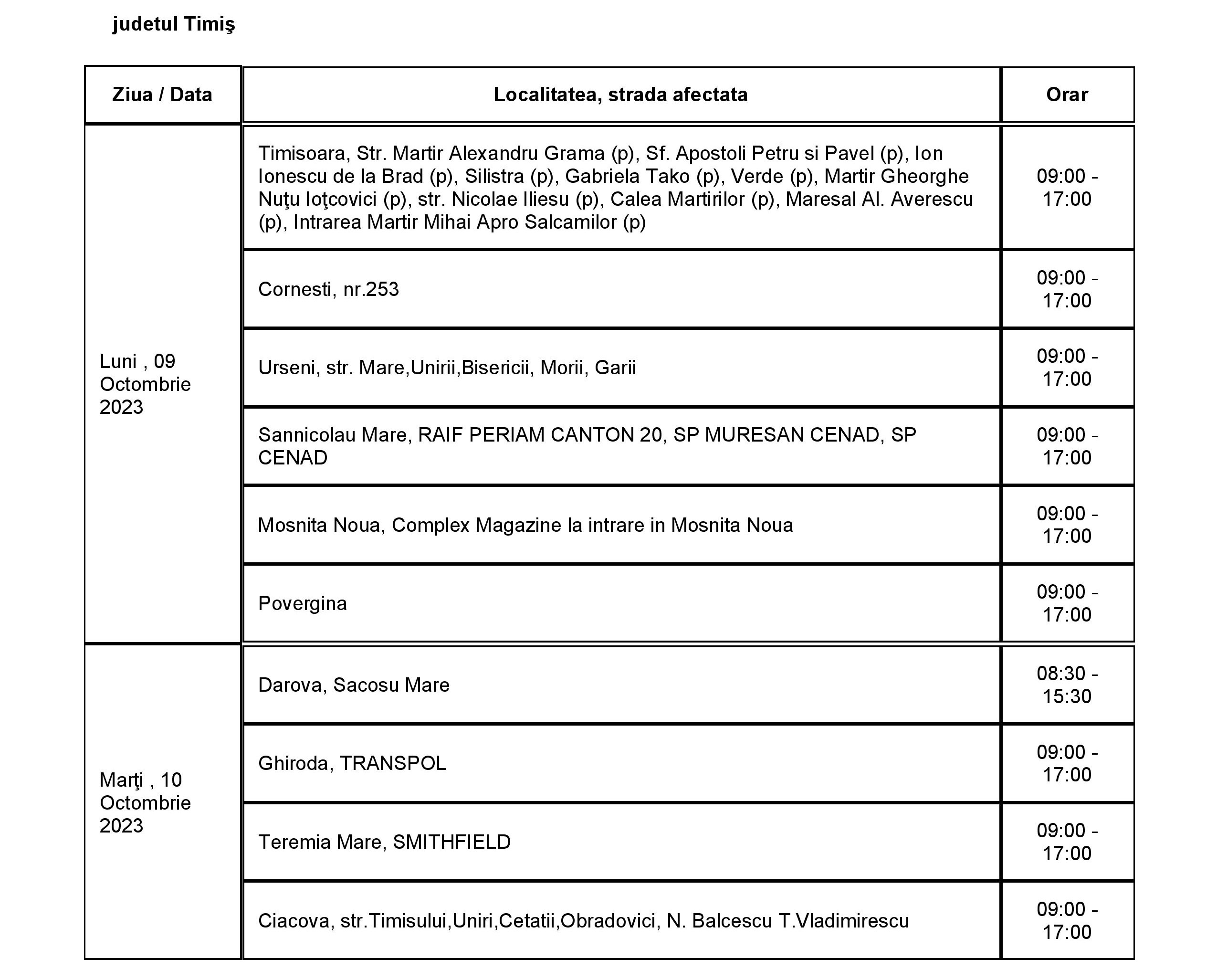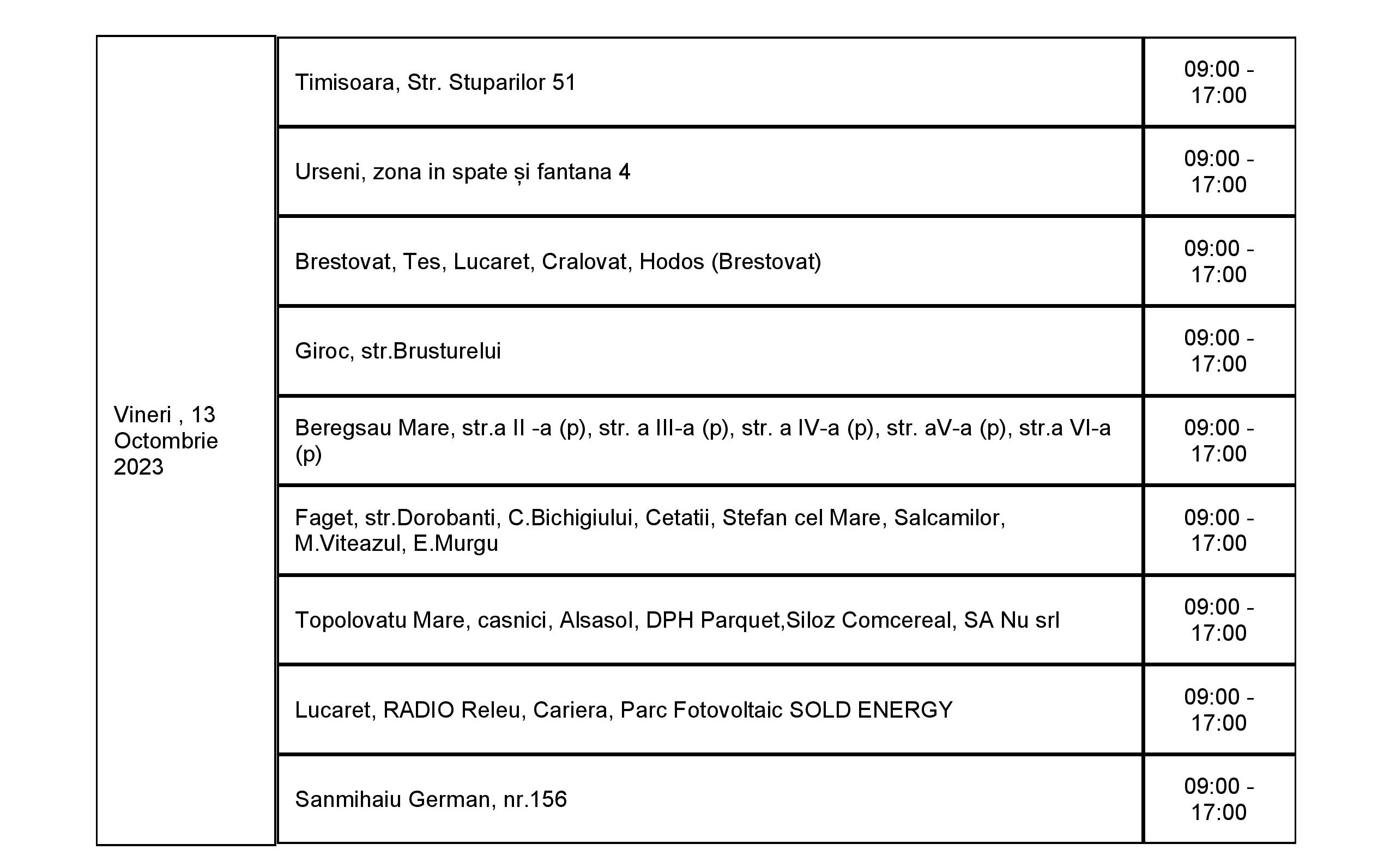 Lucrările au fost reduse la cele care sunt necesare pentru a asigura capacitatea rețelei de a funcționa și a alimenta clienții cu energie electrică în bune condiții. În perioada 9 – 15 octombrie, curentul va fi întrerupt astfel: