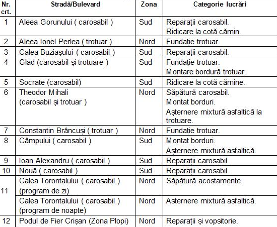 Lucrările care vizează reparațiile de drumuri au loc în următoarele locuri: