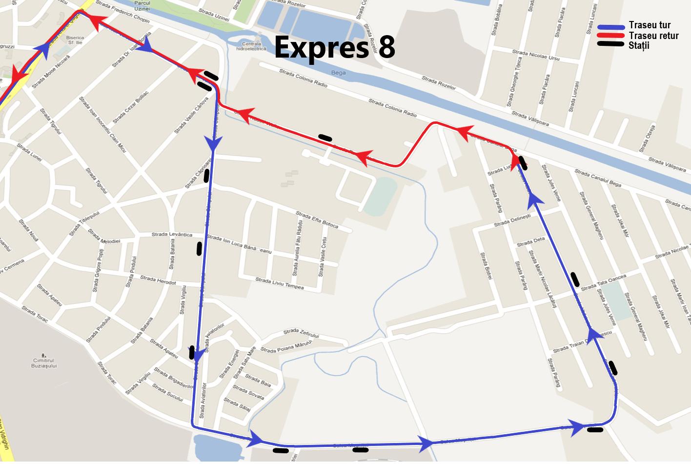 - Linia Expres 8 va circula în zona Plopi – Kuncz pe traseul: strada Iosif Vulcan – strada Câmpului – strada Torac – Calea Moșniței – strada Albăstrelelor – Canal Bega – strada Rudolf Walter – strada Câmpului – strada Iosif Vulcan.