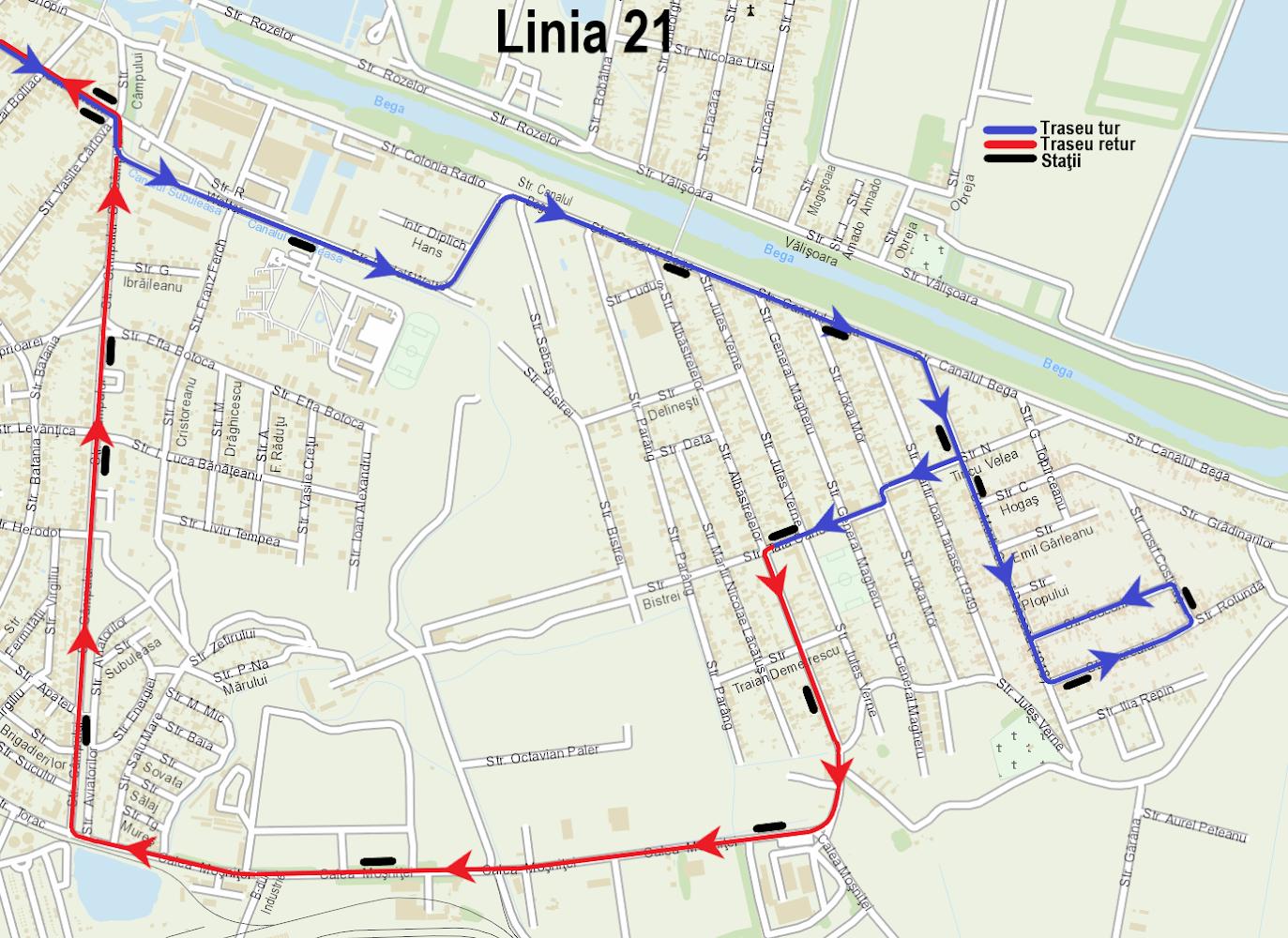 - Linia 21 va urma următorul traseu în zona Plopi – Kuncz: strada Iosif Vulcan – strada Rudolf Walter – Canal Bega – strada Martir Cornel Popescu (1918) – strada Parcului – strada Iosif Costinaș – strada Cocorilor – strada Martir Cornel Popescu (1918) – strada Tincu Velea – strada Tata Oancea – strada Albăstrelelor – Calea Moșniței – strada Câmpului – strada Iosif Vulcan.