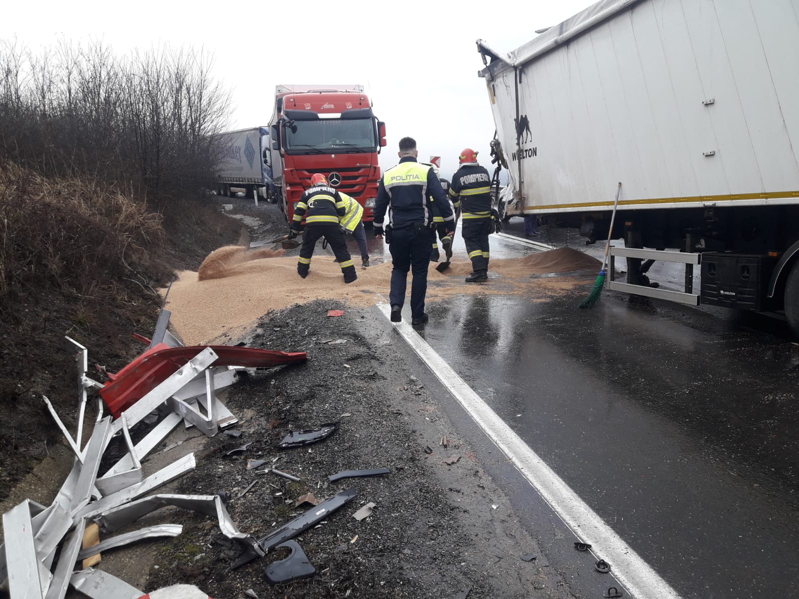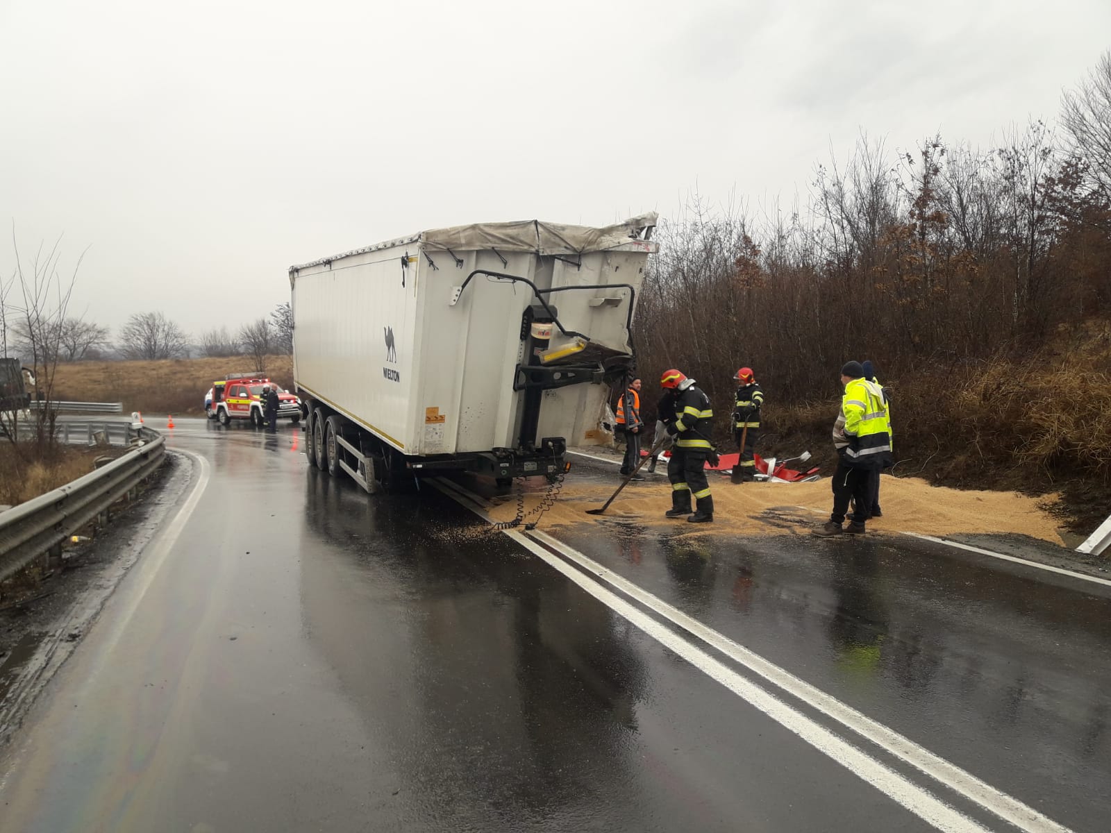 Remorca unui autocamion încărcat cu cereale s-a desprins și a intrat în coliziune cu un alt autocamion. Circulația rutieră este închisă până în jurul orei 14.