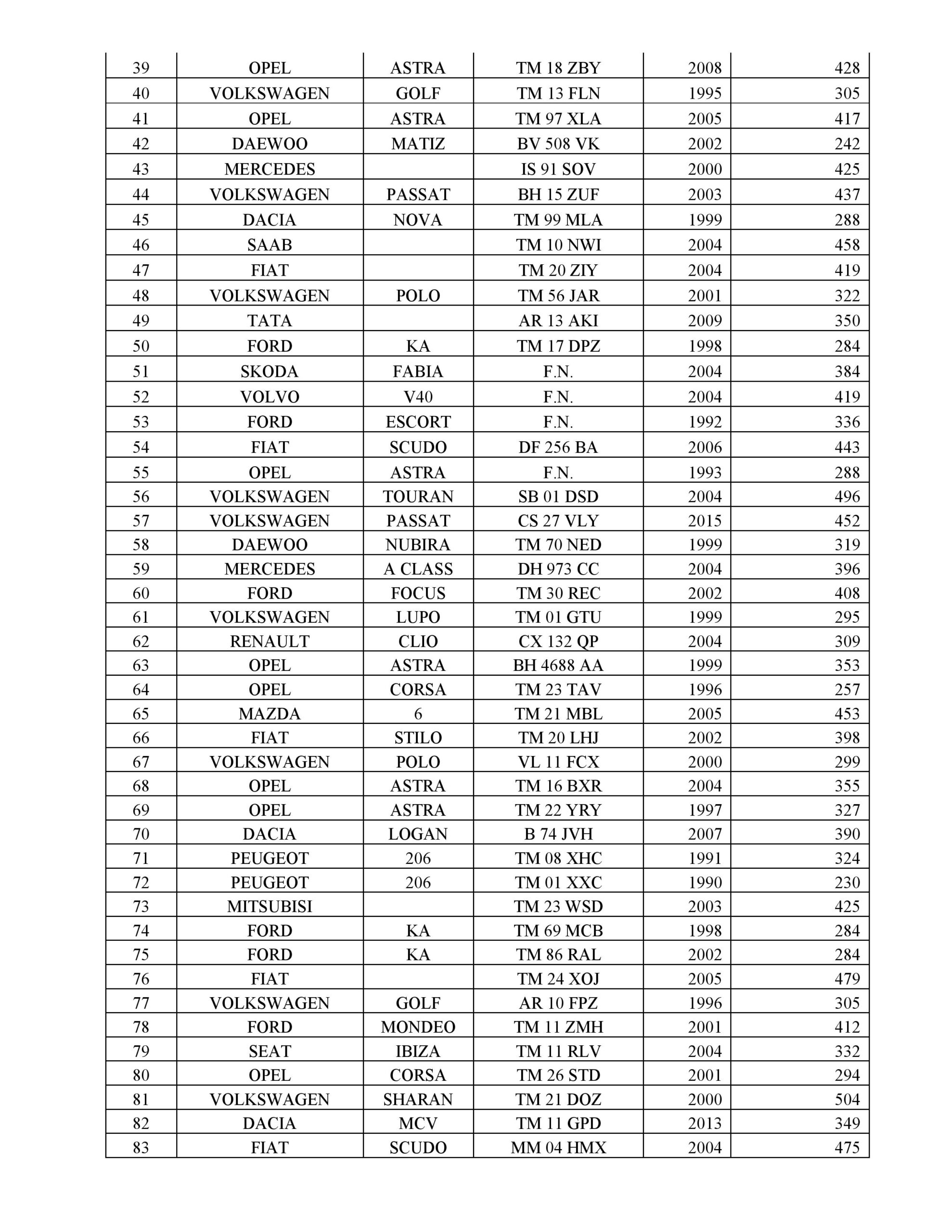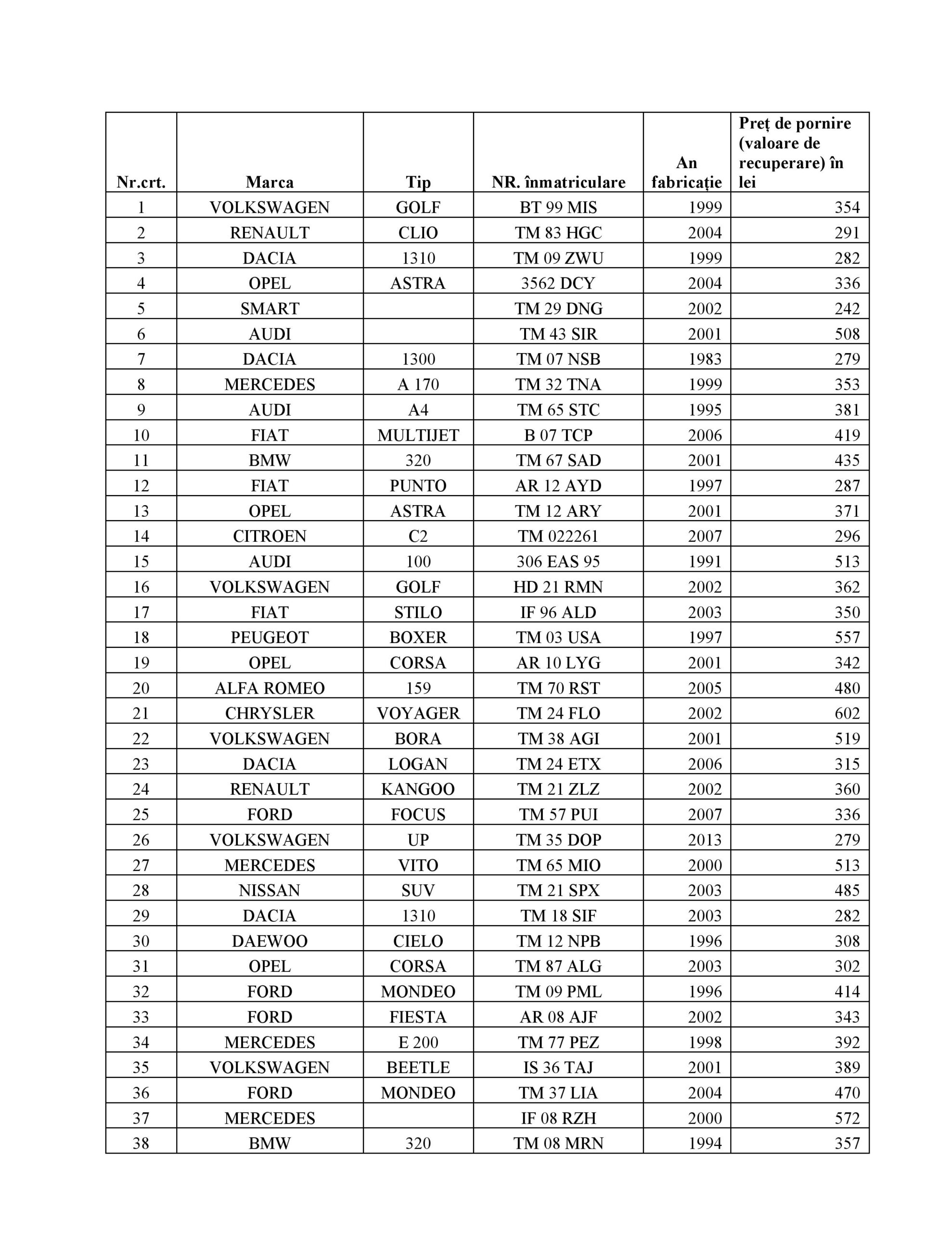 Subscrisul Serviciul Public de Interes Local pentru Administrarea Parcărilor Publice din Municipiul Timișoara – TIMPARK, cu sediul în Municipiul Timișoara, Splaiul Nicolae Titulescu, nr. 10, jud. Timiș, CIF RO45421239, e-mail: juridic@timpark.ro și număr de telefon: 0256493393, anunță organizarea licitației deschisă cu strigare, pentru valorificarea următoarelor vehicule fără stăpân/abandonate pe terenuri aparținând domeniului public sau privat al statului ori al unității administrativ-teritoriale Municipiul Timișoara, trecute de drept în proprietatea privată a Municipiului Timișoara: