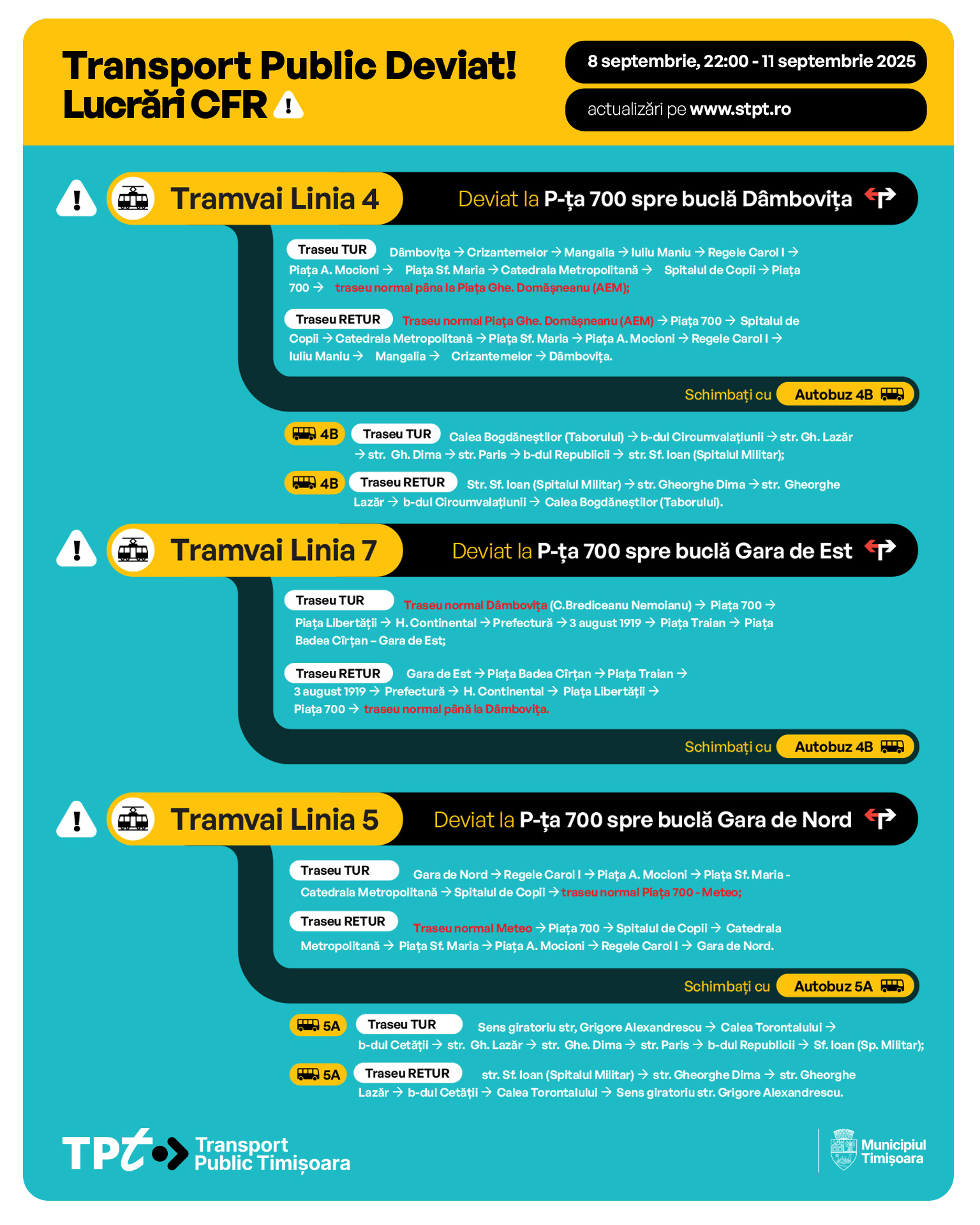 În ceea ce privește tramvaiele, STPT anunță că, în perioada 8 septembrie, ora 22 – 11 septembrie 2025, ora 23, traseele vor fi modificate astfel: